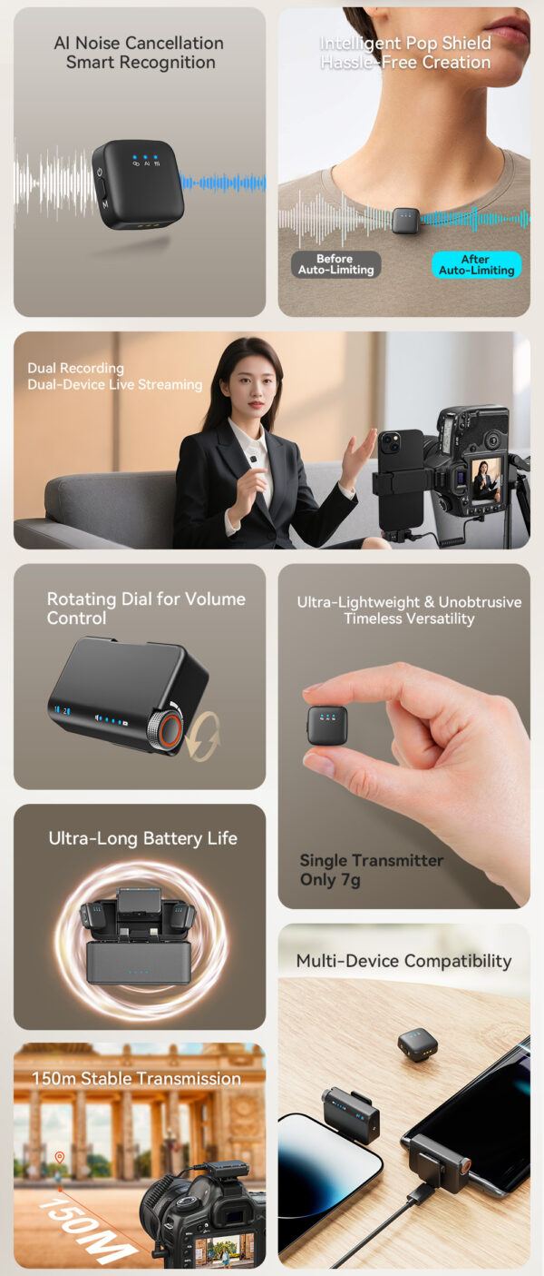 Con un diseño único, una artesanía exquisita, una calidad de sonido clara y una batería de larga duración, son la herramienta de grabación perfecta para transmisiones en vivo, vlogs, videos educativos y todo tipo de escenarios de grabación de video.